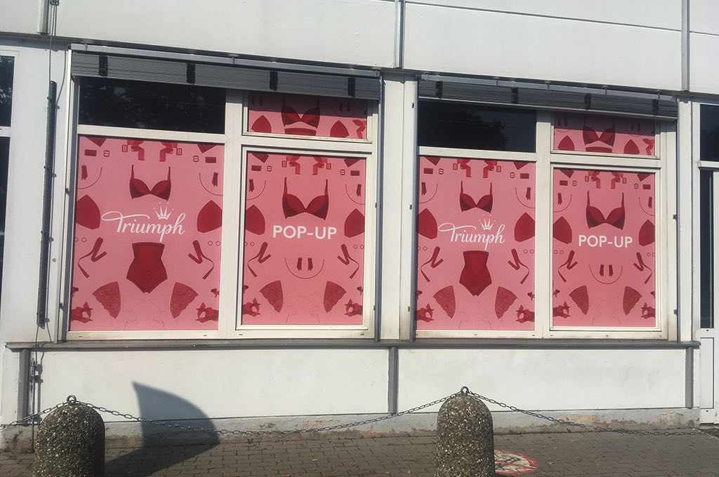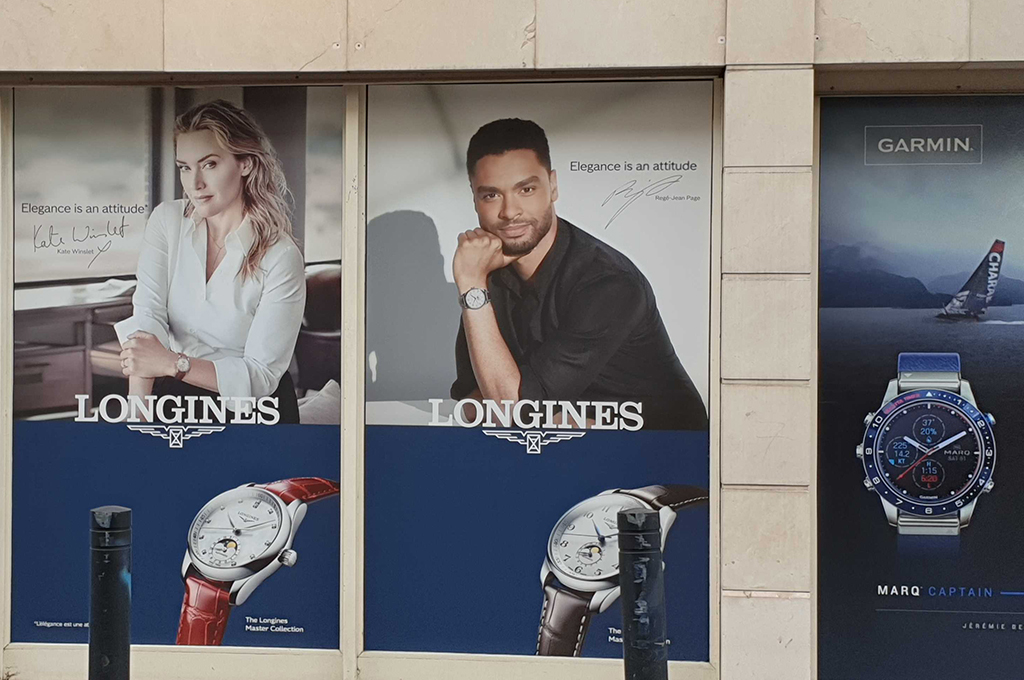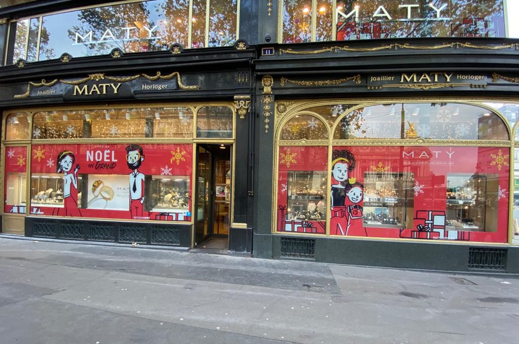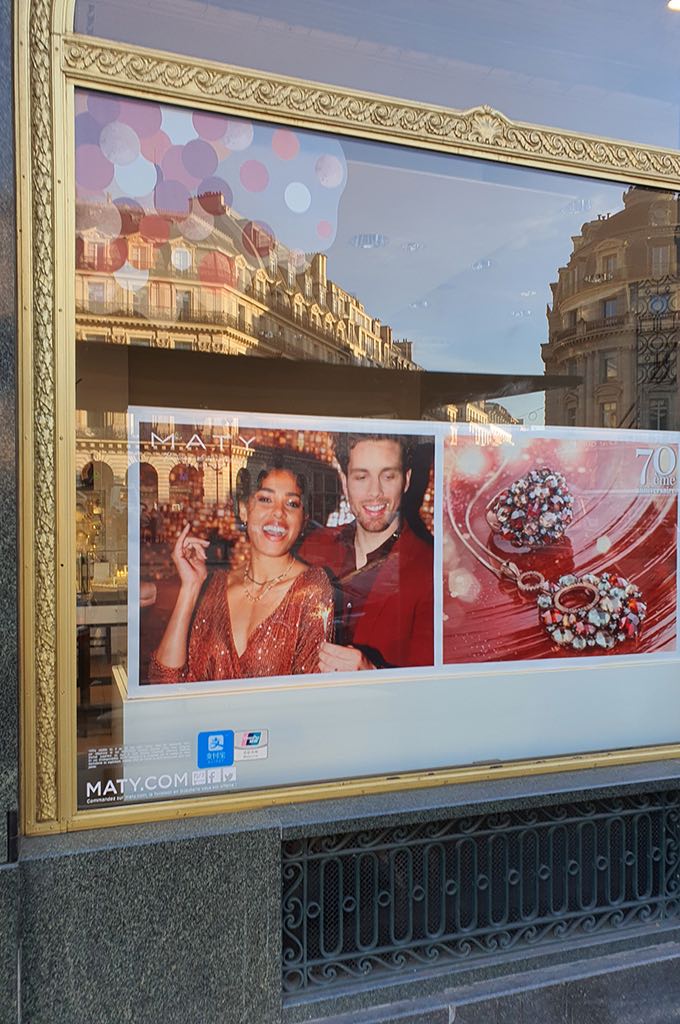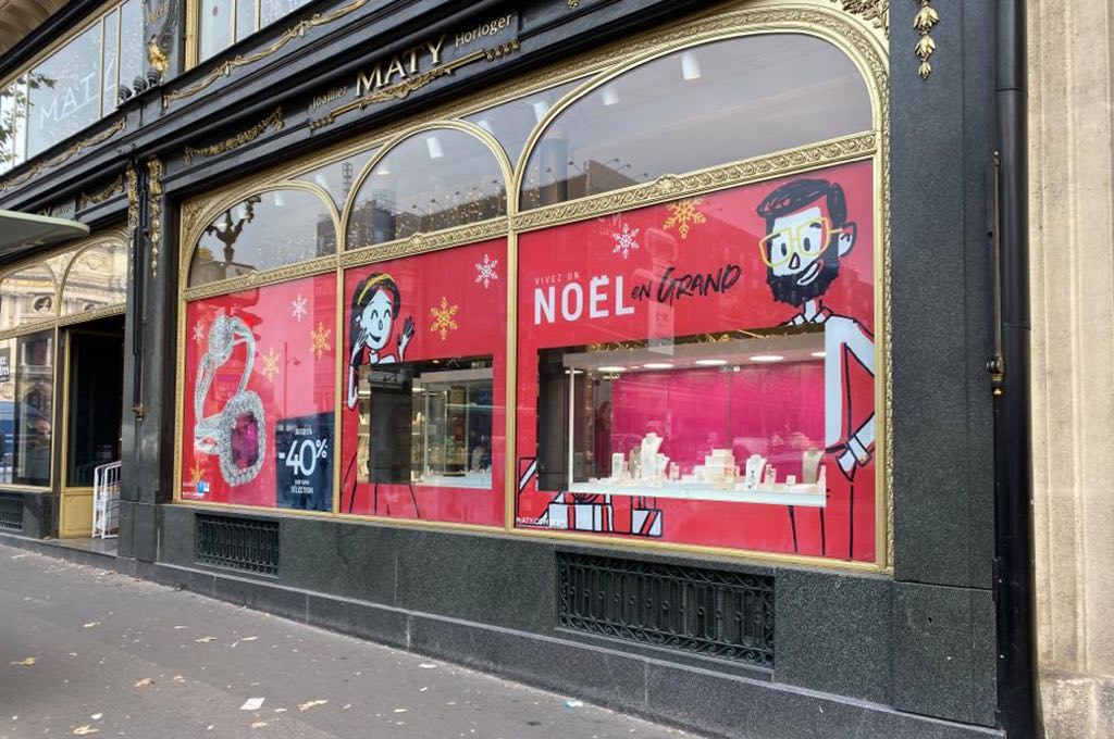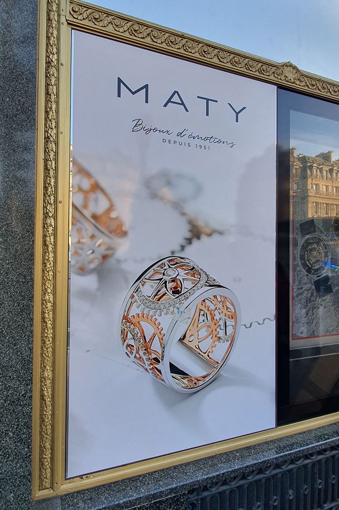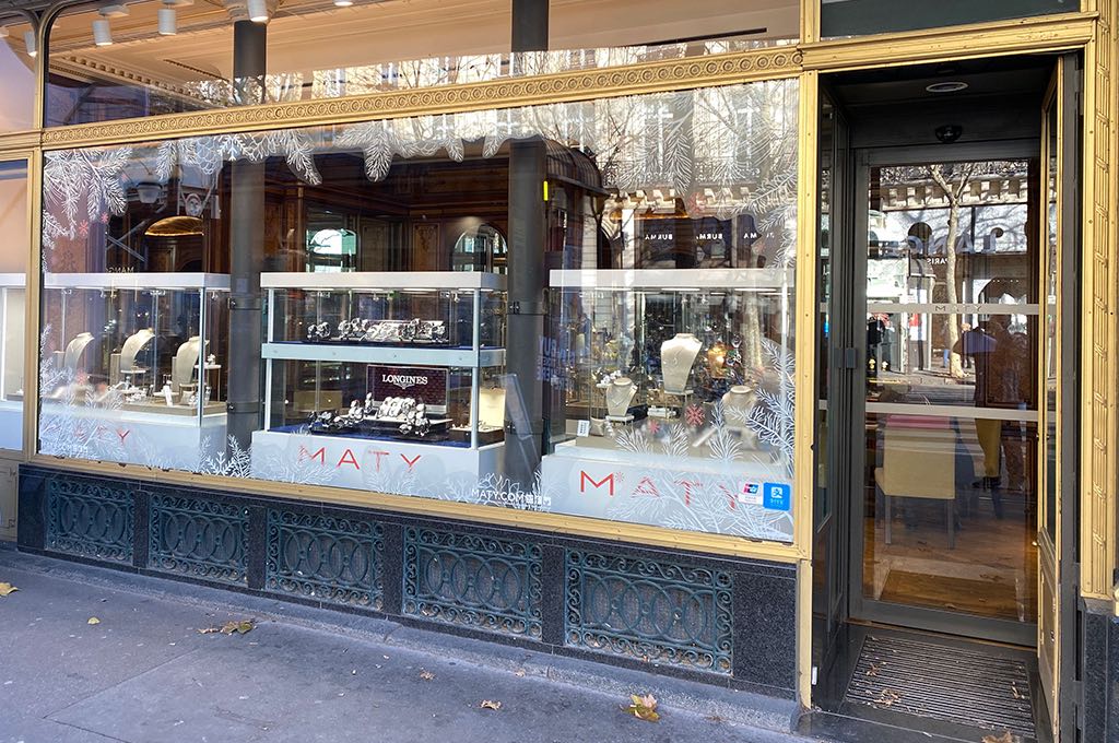 Impression en Latex sur adhésifs opaques et transparents inversés, découpe partielle à la forme, pose depuis l'intérieur de la vitrine. Maty Opéra Paris